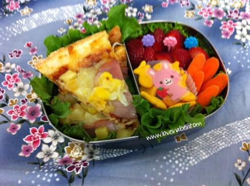 This is my American version bento. Some people think that bentos always need to have Japanese food in them. But this is not a Japanese food bento. This is an all American bento – filled with Hawaiian pizza (pineapples on pizza still weird me out, but my kids love it). Again, I haven’t had much time to think of cute bentos, so this is one that was thrown together very quickly and then decorated with flower picks and the cute bunny baran. 🙂 If you haven’t noticed, I tend to use the same things over and over again.