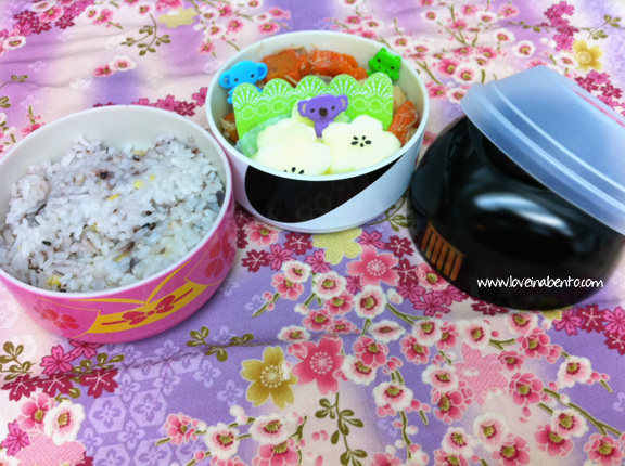 Times have changed and I definitely love Japanese food now, especially nishime. For Ms. Little Bubbles bento, I packed her red bean rice and nishime. Although, you cannot see the nishime as it is behind the green divider and apples. However, the highlight of this lunch is not the nishime (surprisingly!).  Rather, it is the container.  It is supposed to be a soup container, but I think it works without soup too.  Don’t you think it is just the cutest?  Mr. LoveInABento got us matching soup bento boxes.  🙂