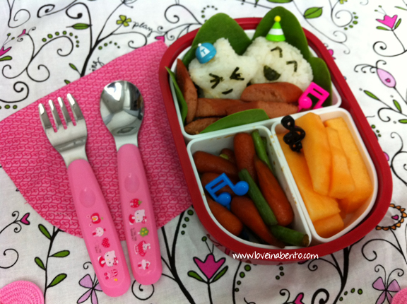 Contents:  shoyu sugar hot dogs, happy onigiri’s, carrots, beans and cantaloupe