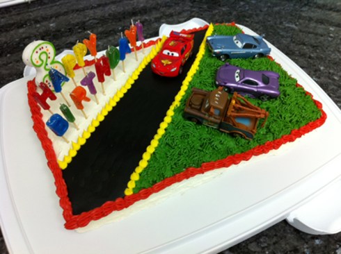 I’m nervous and excited to show you the very first decorated birthday cake I’ve ever made. It was Mr. Sweet Pea’s third birthday and I decided to make him a Disney Cars cake. I’m not sure what got into me, but I think it had something to do with me being on vacation, feeling really relaxed and thinking I could do (and have the time to do) anything. I found an inspiration cake on the web (I will post the link as soon as it’s back up. It’s broken right now.) and thought “hey, I can do that”. I chose an inspiration that had clean lines and seemed simple to do. I was fortunate and so grateful to my good friends for giving me a cake decorating set last Christmas. It is seriously the grand daddy of all decorating kits. Included in the kit was everything I needed to make the borders and grass. The grass tip is the most awesome tip I’ve ever seen!
