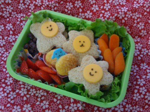 For this bento, I have a simple tip – cut out a cheese flower, put a cute face on it (made with my quail egg nori punch) and tada – a simple cheese flower that will make your little one smile.