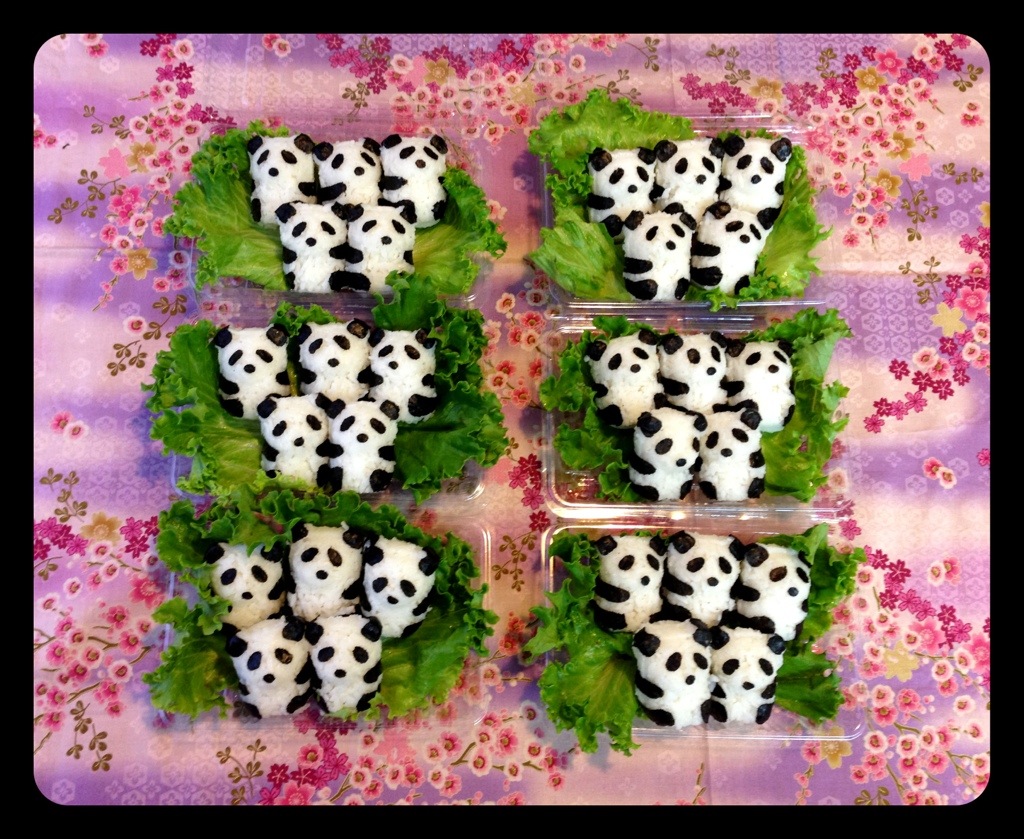 I punched out the nori last night and woke up early to assemble the pandas. My husband helped me by waking the kids up and making them breakfast. That was a huge help. It took me about 10 minutes to make 5 pandas. I know… nuts! I have a friend that thinks I’m out of my mind. LOL!