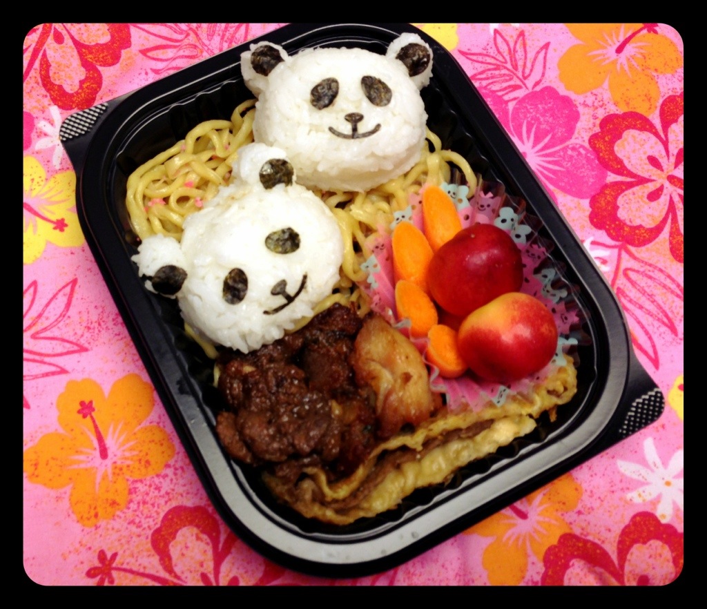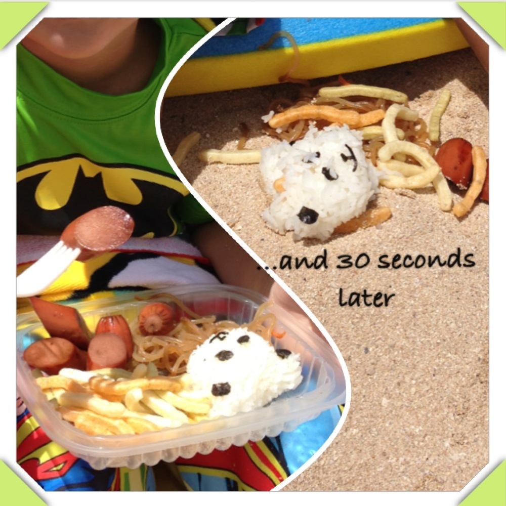 I made my son a panda bento, similar to my nephews, for our trip to the beach. We were all excited to be at the beach and ready to eat our lunches. Buy literally 30 seconds after giving my son his lunch, he dropped it in the sand!!!! So sad!!! We each shared part of our lunch with him. Ironically, he wasn’t too sad about the panda musubi. He was more upset about losing his noodles! Lol! 🙂